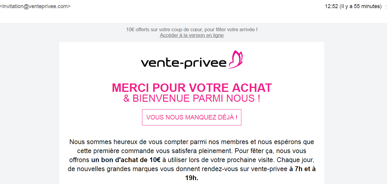 Les mecs Vente privée vient de m'envoyer un mail y'a 1 heureils me remercient des commandes que j'ai passé
