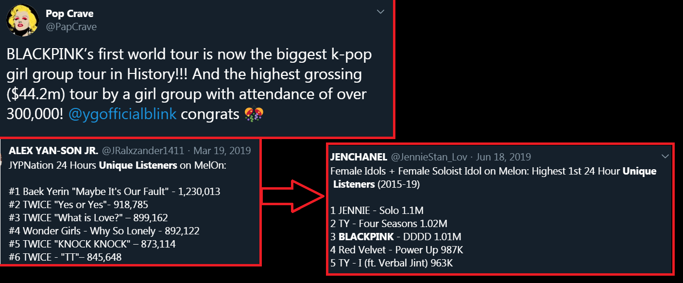 Il y a tellement de recherches à faire mais t'as compris l'idée. Oui, il y a d'autres points à ajouter et on trouverait un avantage pour Twice, Blackpink ou d'autres GGs mais on peut constater que Blackpink se défendent assez bien