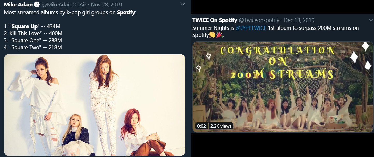 Elles ont plus de poids à ce niveau-là (réseaux sociaux, vues, etc.). On est d'accord non ? Les chiffres sont assez clairs. Quand Twice n'arrive même pas à avoir un retour alors qu'elles cover ou soutiennent les artistes internationaux, Jennie est invitée à des fêtes privées et elles font des photos avec des stars.Spotify...