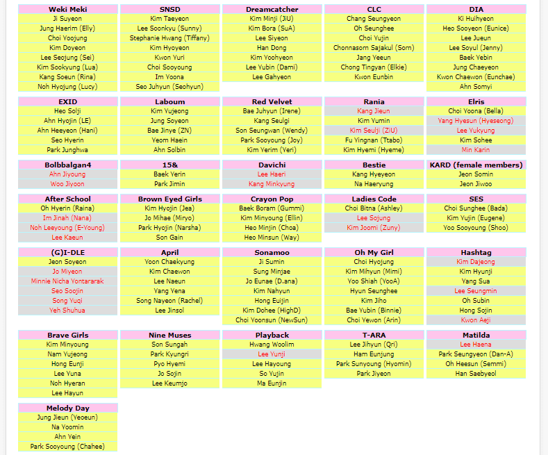 Chez Good Day il y a une Chaeyoung, une Heejin, une Hyunjoo et 3 JiwonPour Bolbbalgan, Davichi et Elris, j'ai même pas essayer.