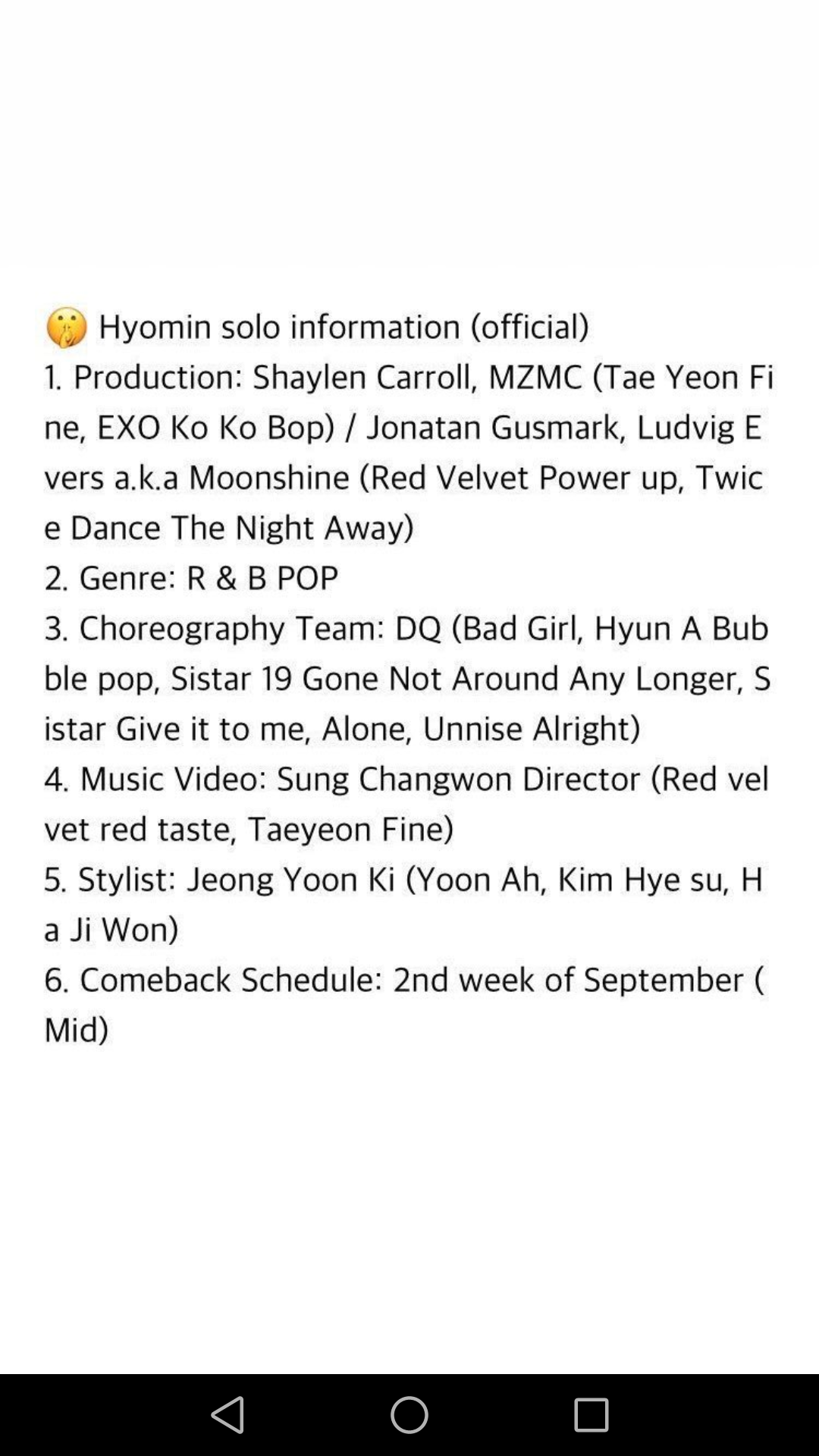 Hyomin annonce son comeback sur son compte Instagram et elle a en n'as mit des moyens sur la prod.Le comeback sera pour Septembre.
