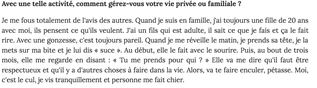 Il a raison, il vit sa vie à fond et s'en fout des gensAh oui quelle bel objectif, aller violer des cassos désespérées en détresse sociale c'est vraiment la belle vie