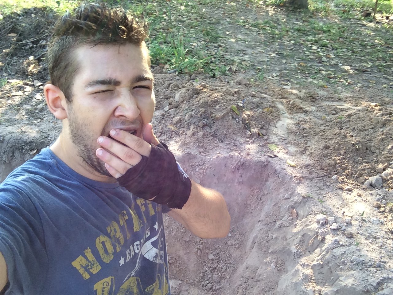 L'auteur qui creuse des tranchés pour le fermier fou qui croit que la guerre n'est pas finie