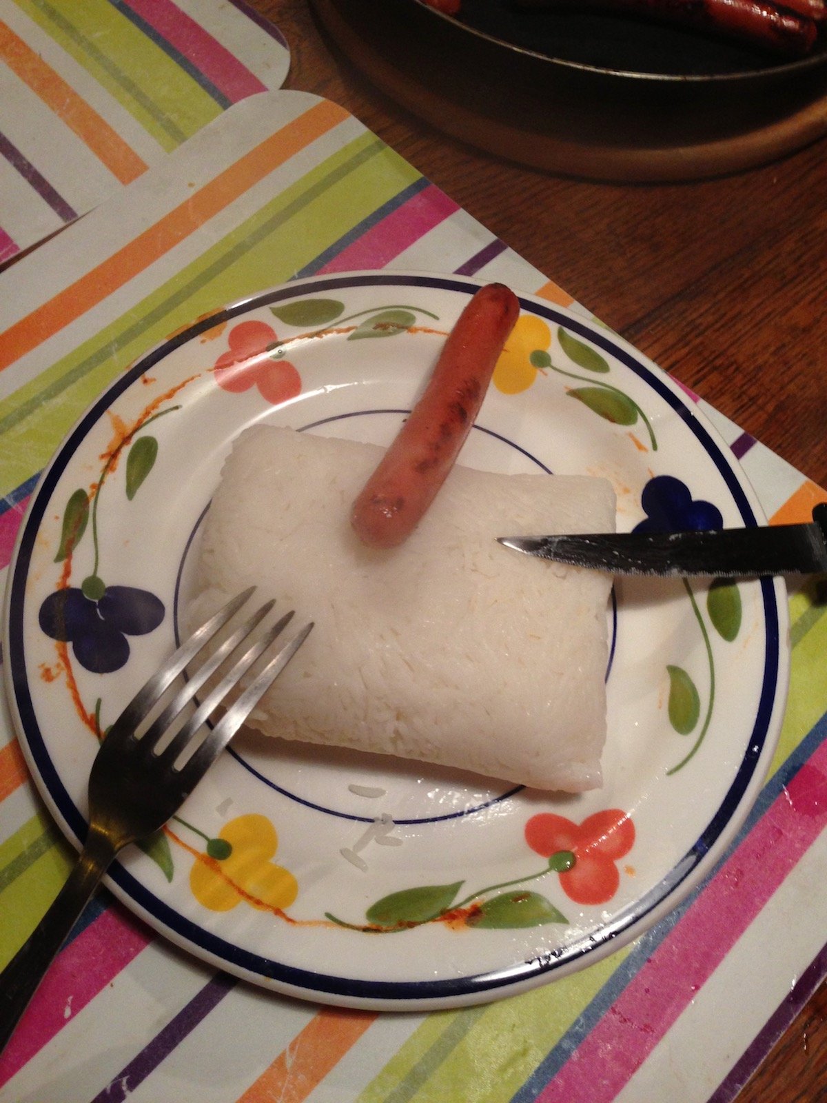 L'astuce pour avoir un plat esthétique, c'est de faire cuire le riz longtemps, trop longtemps, afin qu'il soit bien mou et compact, comme de la bouillie. Ensuite vous posez le sachet dans une assiette et vous l'ôtez délicatement du tas de riz afin que celui-ci garde sa forme initiale. Vous n'avez plus qu'à déposer la knacki dessus