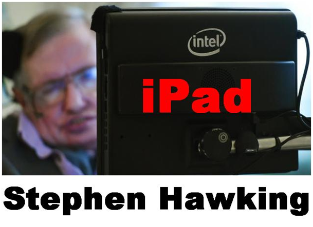 Photo : Stephen Hawking devant son iPad… recevant les directives de la secte ADII... remarquez que le mot IPad rime bien avec AD (celui de la secte ADII) ...mais c'est juste un pur hazard !