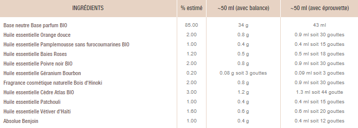 En se basant sur un parfum à 10% et 50mL de parfum, ça veut dire qu'il y aura 5mL d'huile essentielle dans le parfum pour 45mL d'alcool. Dans ces 5mL, on aura 20% de tête, 40% de coeur, et 40% de fond. Donc 1mL, 2mL et 2mL. Facile non ?