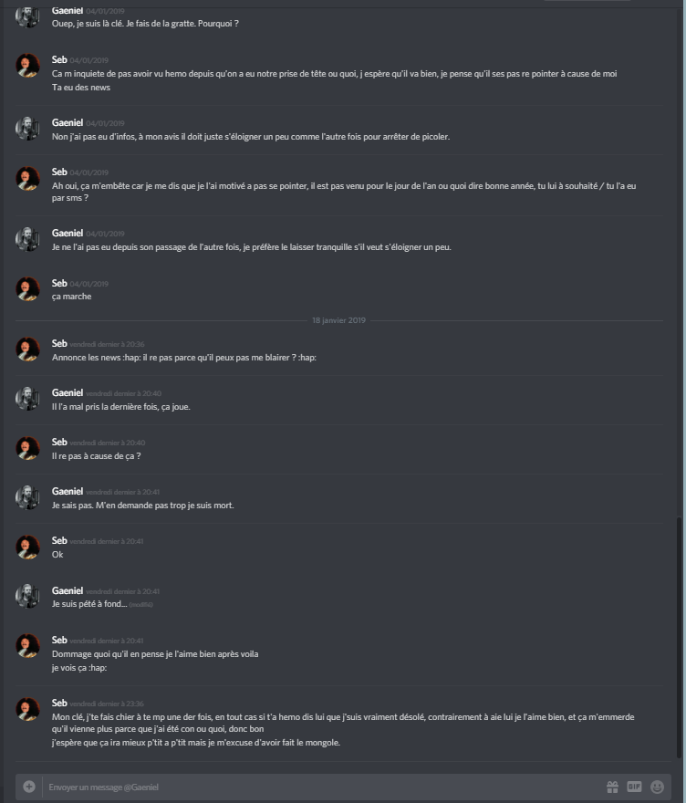 "J'me foutait de votre gueule", pardon ? C'est vraiment happiste de dire ça. J'ai dit qu'il fallais arrêter de flame, et de le sms 500x, ou tous appeler à tour de rôle, tout les jours vous étiez la à penser au pire, à parler suicide. Effectivement sur ce point je me suis trompé, mais je me suis jamais moqué, à te lire on croierais que j'ai dit à un moment "lol ce con va faire une tentative" ou des saloperies du genre. J'ai dit qu'il était probablement en bonne santé, que très probablement il voulais juste s'éloigner du discord, de l'alcool, des tensions récentes, et que fallait arrêter un peu de faire des théories dans tout les sens. Paie ton foutage de gueule.