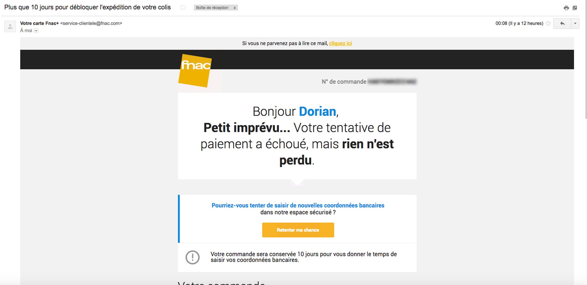 J'ai effectué un achat sur le site de la Fnac et tout allez bien jusqu'à que je reçois ce mail bizarre :