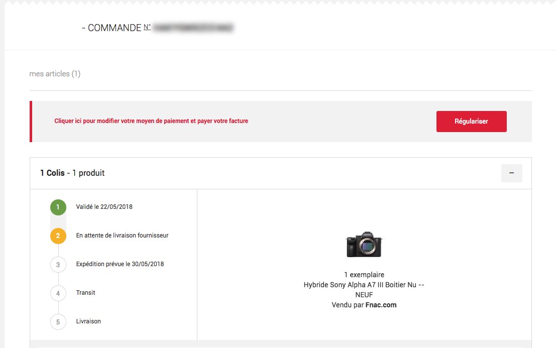 Ne sachant que faire j'ai appelé le numéro du service client Fnac (avec au bout du fil une dame qui parle à peine français) m'expliquant qu'il faut que j'envoi un mail au service facturation de la Fnac et quand je lui dis qu'il y a un bouton 'Régulariser le moyen de paiement' sur le site, elle me dit que non il faut passer par mail avec le service facturation (au quel j'ai envoyé numéro de commande, date de commande, montant total, et numéro de téléphone) et qu'ils me rappelleront pour régler ça.