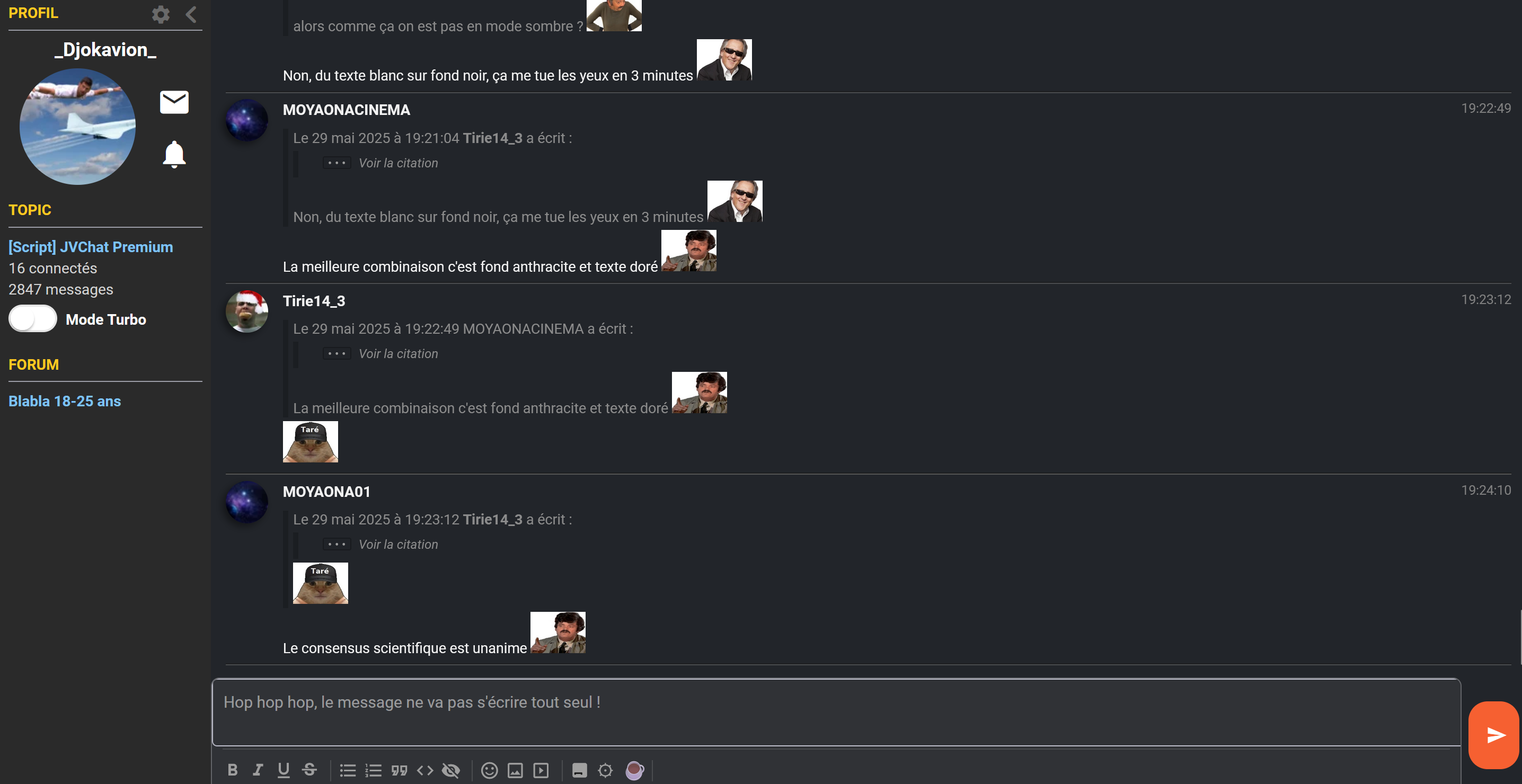 Tu supprime d'abord le script jvchat premium que t'a et ensuite tu met lui https://github.com/Rand0max/jvchat-fork/raw/refs/heads/master/JVChat_Premium.user.js