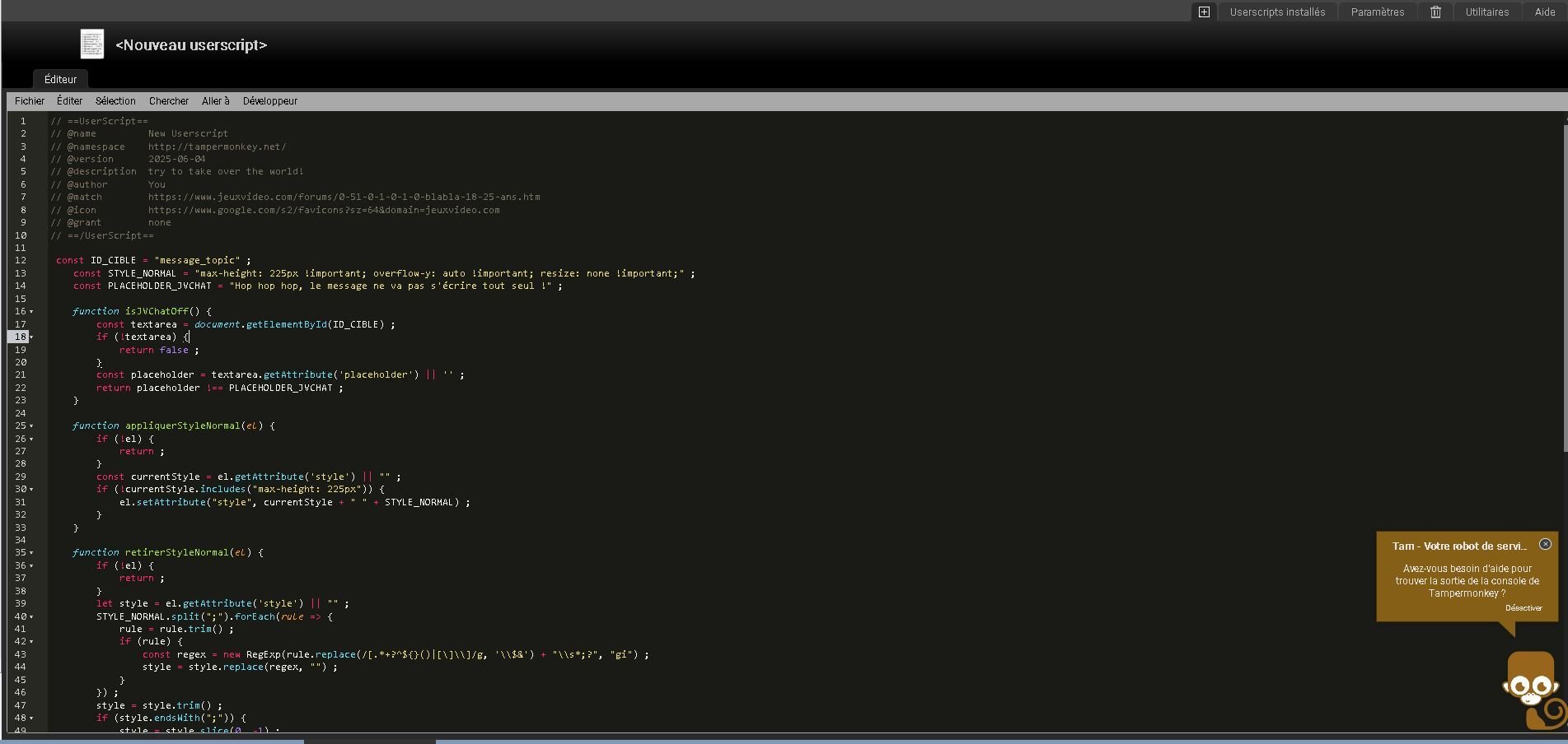 function isScrollDown() { > > const element = document.getElementById("jvchat-main"); > > return (element.clientHeight + element.scrollTop) >= (element.scrollHeight - 2); > > }Ce morceau-là c'est une fonction à la toute fin (dans les lignes 3850 et quelques). Perso j'ai gardé celle d'origine :