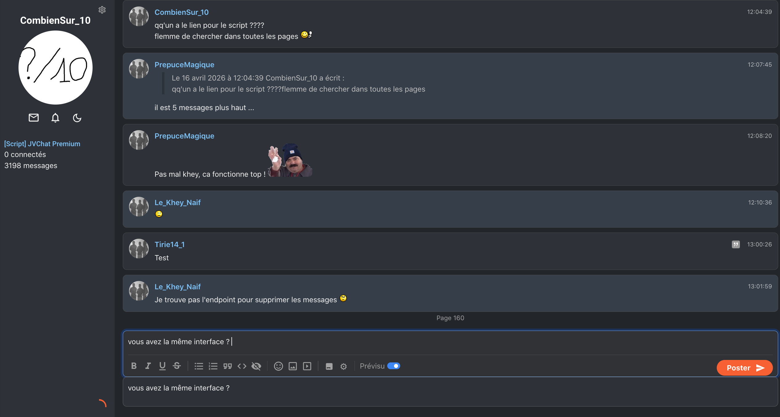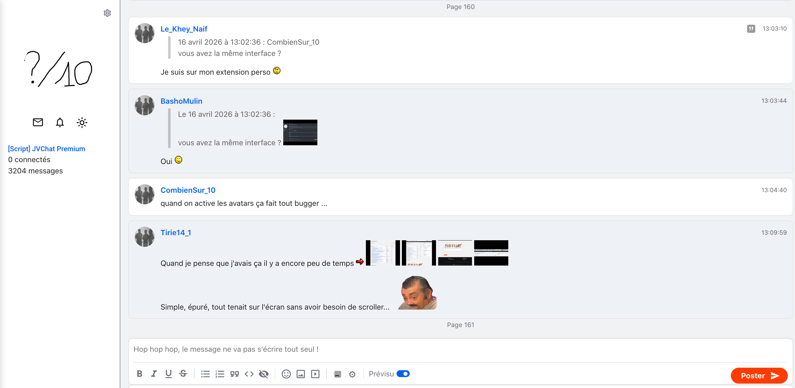 Le 16 avril 2026 à 10:45:47 SleepyRomanie a écrit :Ca marche par contre on peut pas enlever la barre a gauche avec le pseudo Et si on quitte et on revient sur la page ca se met automatiquement en bas de page c'est pas forcément pratique Quand on écrit un message la barre de texte revient automatiquement sur la 1ere ligne écrite, obligé d'avoir la prévisu activé sinon on voit pas ce qu'on écrit Mais bon c'est mieux que rienAgrandis la taille de la barre de texte comme j’ai montré plus haut (valeur rows), c’est plus confortable.