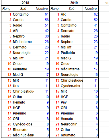 - La dermato, la néphro, la neuro et la med interne continuent de gagner des places mais chiffres toujours insuffisants au regard des années précédentes pour les 3 dernières (tout le contraire de la dermato, prisée cette année, $$)