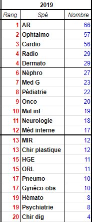 Tout à droite, le classement cumulé => la cardio est toujours la master spé. Et l'AR a cette année dépassé la radio, mais cette dernière peut tout aussi bien repasser en 3ème position après l'ecn 2020...