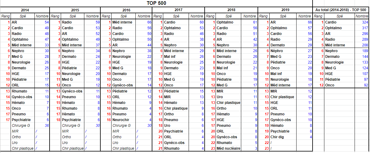 - On retrouve ici des spécialités habituées à ces rangs telles que la MÉDECINE GÉNÉRALE, la PÉDIATRIE ou encore L'ONCOLOGIE qui ont performées en comparaison des années précédentes.