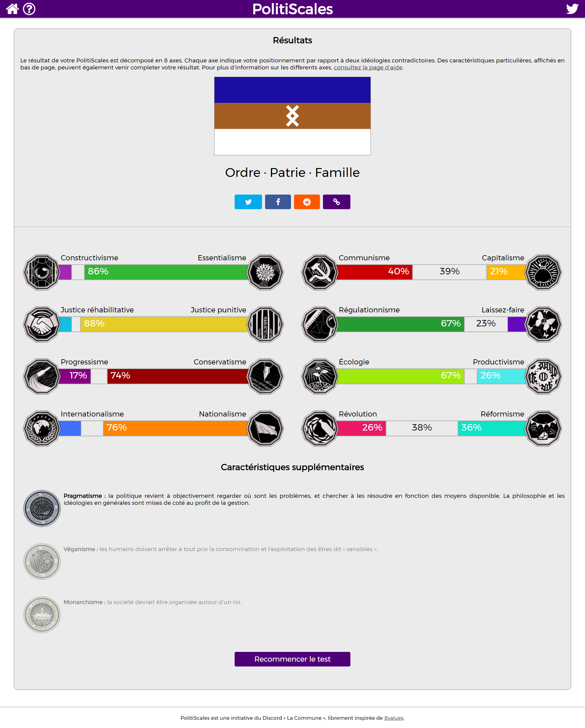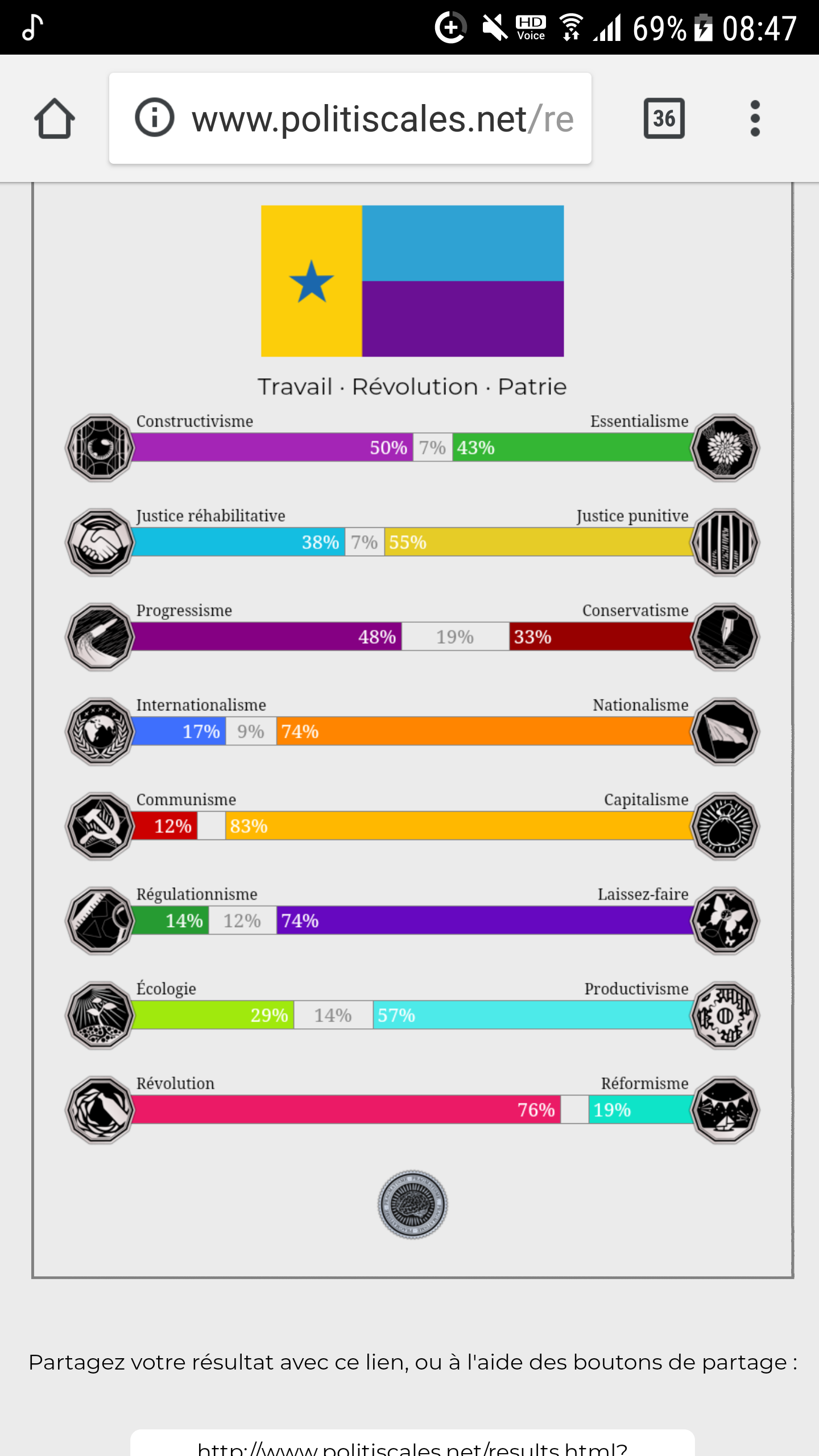 http://www.politiscales.net/fr_FR/results/?c1=45&c0=12&p0=10&p1=48&m1=21&m0=26&b0=31&b1=21&e1=26&e0=24&t1=57&j0=19&j1=38&s0=40&s1=33&femi=10&prag=67Travail, Ordre, Humanité