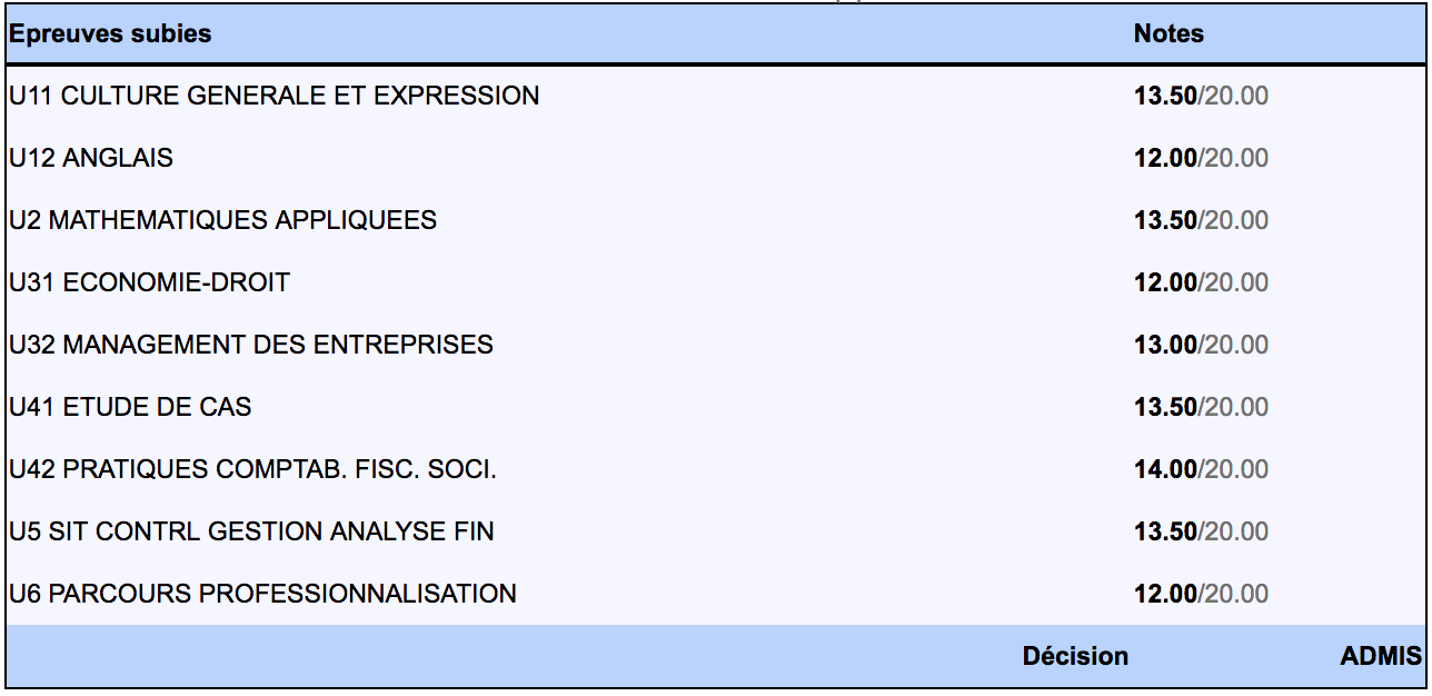 Je savais que j'avais réussi, mais pas à ce point. J'ai fini 2ème de ma classe avec 14 de moyenne, mais ce qu'on avait l'habitude de faire était bien plus consistant que l'examen!