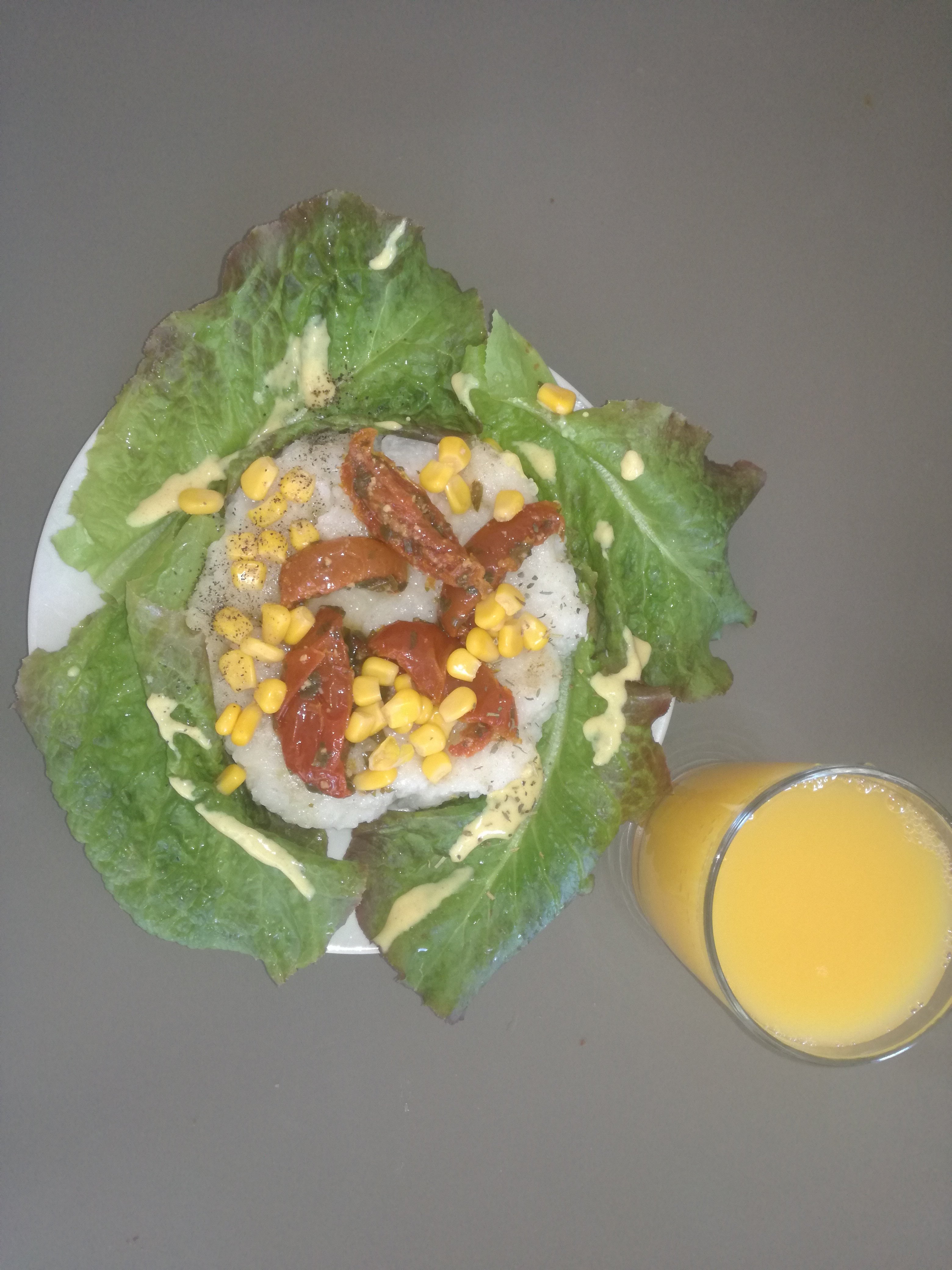 Tomates confites du jardin, maïs bio, salade du jardin, vinaigrette maison. Comme ça!