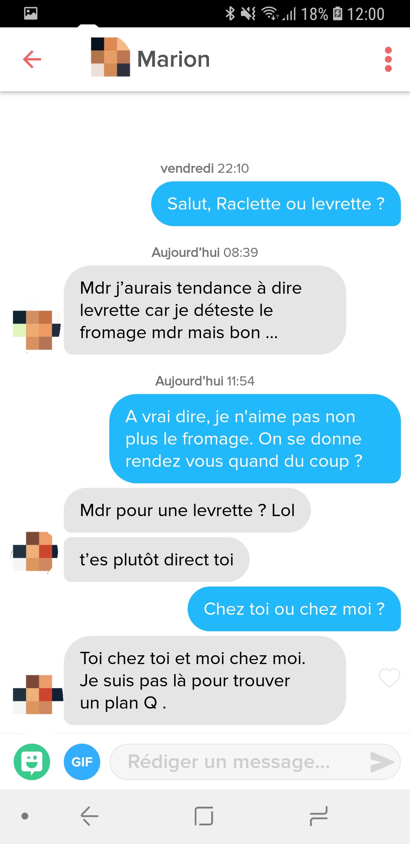 Tu m'envoies un message comme ça et tu as droit à une réponse de ce genre:Ta raclette tu la mangeras avec ton sperme que tu auras en pensant à la levrette que tu feras dans tes rêves