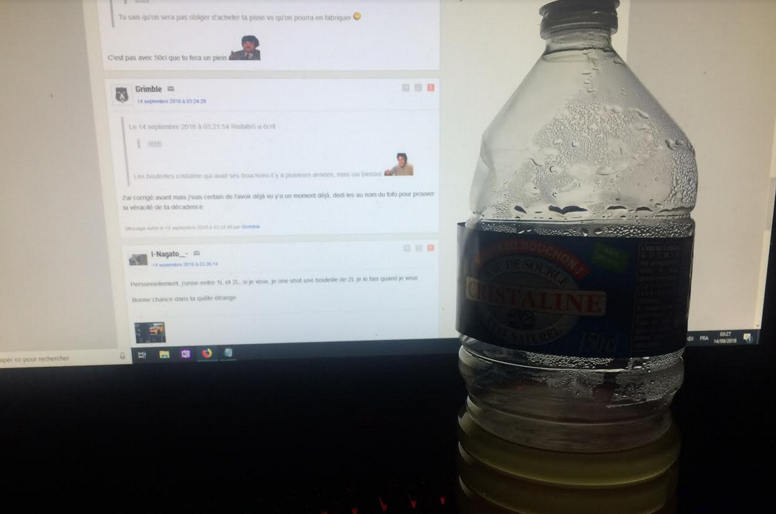 Perso j'ai uriné dans une bouteille une fois dans ma vie, car je ne voulais pas louper un film et il n'y avait pas de pubs, mais garder sa pisse dans des bouteilles, je comprends pas non plus; ceux qui font ça pourraient peut être nous l'expliquer ?