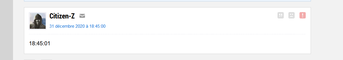 Le 31 décembre 2020 à 18:41:54 Zesuitriso1321 a écrit :Le 31 décembre 2020 à 18:41:03 Gojosensei a écrit :Je connait l'astuce pour faire le 00h000 je dit pasOn s'en fout de ta vie