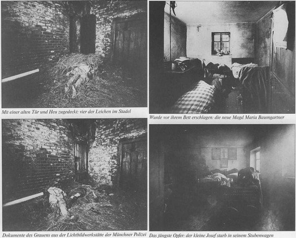 Le 6 avril 1922, le Dr Johann Baptist Aumüller (médecin de la cour) effectue les autopsies dans la grange. Il établit que la pioche est l'arme la plus probable. Les cadavres sont décapités après l'autopsie, et les crânes envoyés à Munich. L'autopsie révèle que la jeune Cäzilia a survécu pendant plusieurs heures après l'agression, allongée dans la paille, à côté des corps de ses grands-parents et de sa mère ; elle se serait arraché les cheveux par touffes entières.