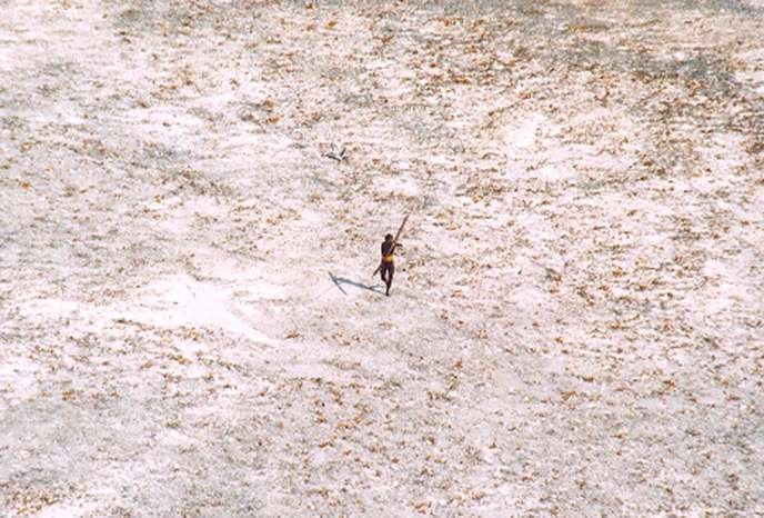 Cliché pris après le tsunami de décembre 2004 montrant un membre de la tribu des Sentinelles essayant d’abattre un hélicoptère des gardes-côtes indiens à l’aide d’un arc et de flèches.