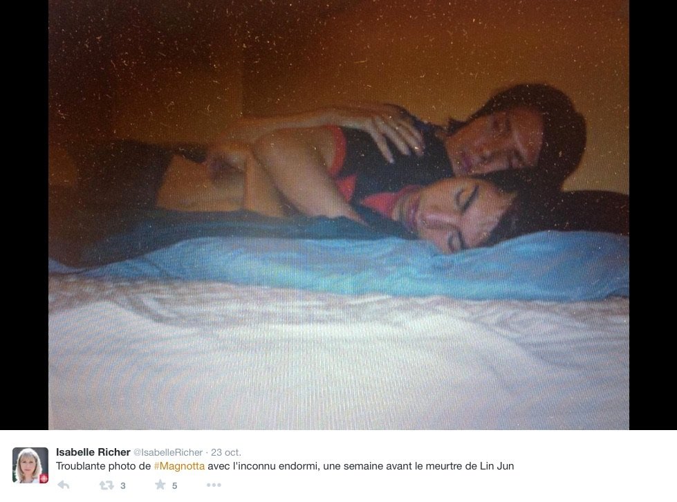 En mars 2012, moins de trois mois avant le meurtre de Lin Jun, Magnotta est l'objet d'un article de blog - probablement rédigé par lui-même - qui le présente comme un tueur en série nécrophile[19].