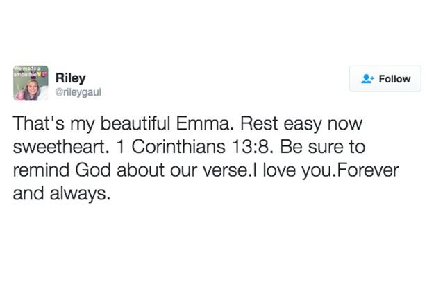 «ma belle Emma, reste tranquille maintenant mon cœur,» a-t-il tweeté. «Il n'y a pas un humain sur terre qui puisse avoir l'impact que tu as eu sur ma vie. Tu me manques plus que tout. Tu me feras mal à l’esprit pour le reste de ma vie car personne ne peut combler le vide qui est dans mon cœur à présent. '