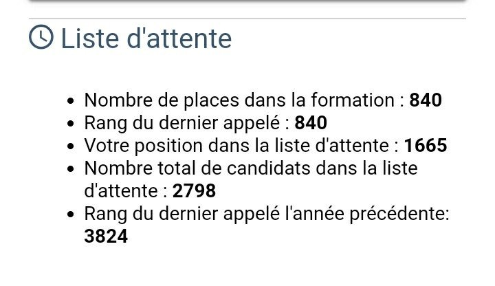 Au lieu de tous poser vos c/c, commencez par regarder votre place dans la liste d'attente puis comparez avec le classement du dernier admis en 2018 pour vous faire une idée les clésDonc le nombre du dernier admis est en faite le nbr du dernier admis en 2018 ? ( c'était pas précisé que c'était celui de l'an passé )