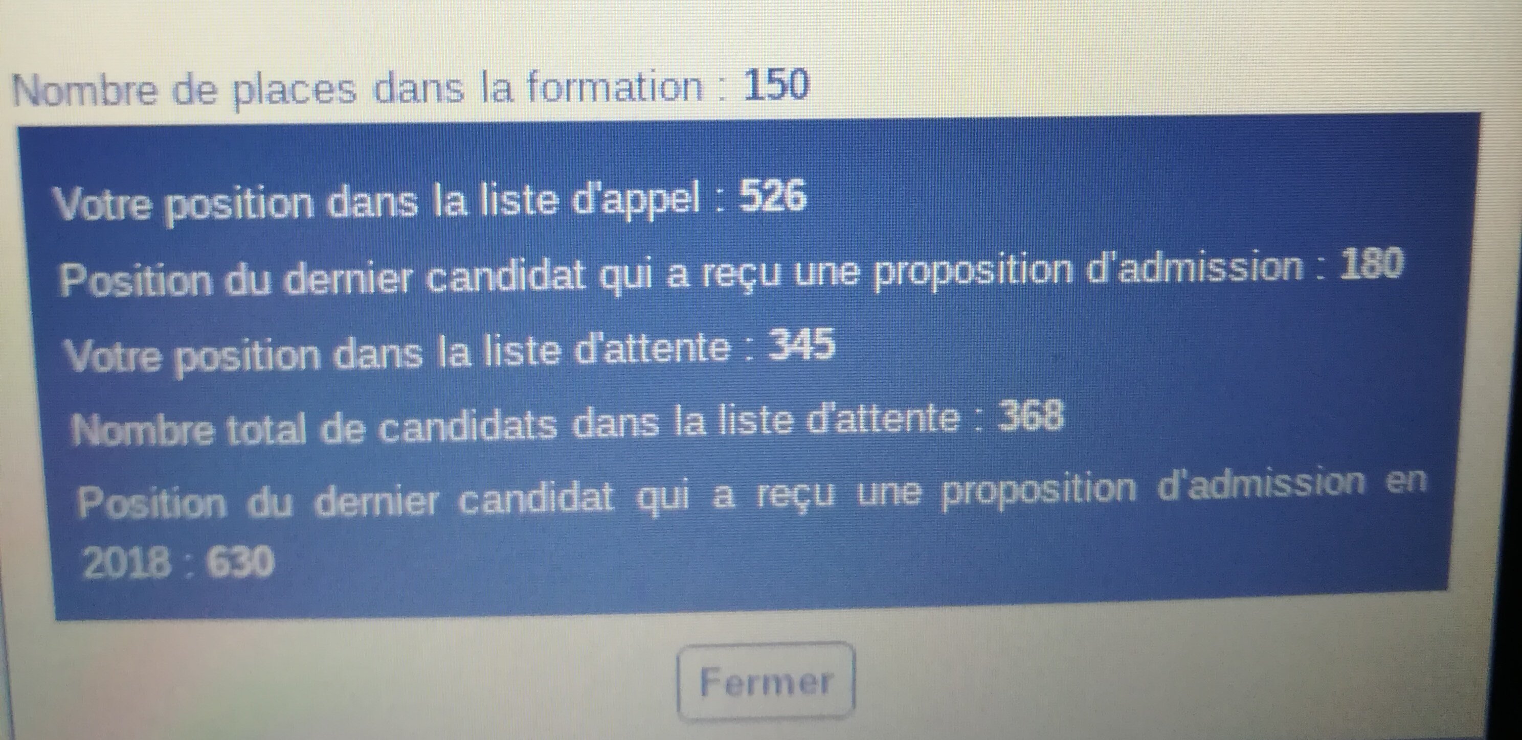 Position du dernier candidat qui a reçu une proposition d’admission en 2018 : 31Demain, à 07h00 du matin