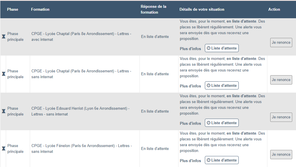Quand vous arriverez n•1, il suffit juste d’un dernier désistement et vous êtes admis, point barre. C’est la seule file qui compte. Vous cassez pas la tête avec la liste d’appel, c’est juste une indication anecdotique (qu’ils ont rajoutée cette année car l’an passé elle n’y était pas) qui montre l’ordre dans lequel les candidats ont été appelés par la formation mais une fois que vous êtes dans la queue juste la liste d’attente compte
