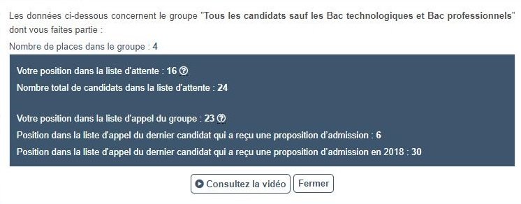 Nombre total de candidats dans la liste d'attente : 1403Votre position dans la liste d'appel du groupe : 648