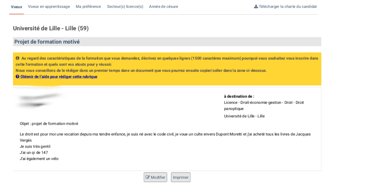 Sinon bien les types qui ont été refusés en Droit alors que j'ai été accepté à 10 de moyenne avec cette lettre de motivation ?![]()