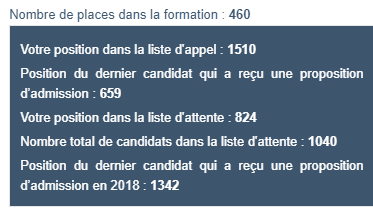 Je suis en liste d'attente sur mon premiers choix à paris 7 diderot en double licence sociologie/histoire, je pense être pris car 164ème sur 489 en liste d'attente et 1002 en liste d'appel, l'année dernière le derniers a été pris en étant 2049ème sur la liste d'appel, et là le derniers a avoir reçu une proposition est 840ème