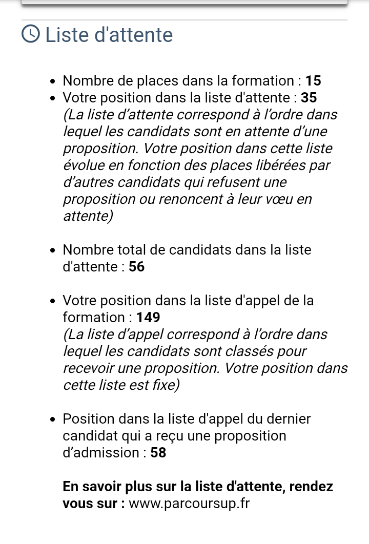Les khey j'ai demandé une Fac parisienne donc sélective, j'ai commencé 5000 ème en liste d'appel et l'année dernière ils prenaient jusqu'à 6400, j'ai avancé de 200 places par jour en liste d'attente et je suis maintenant 2500 mais ça avance plus que 100 places par jourT’as demandé quelle fac ?