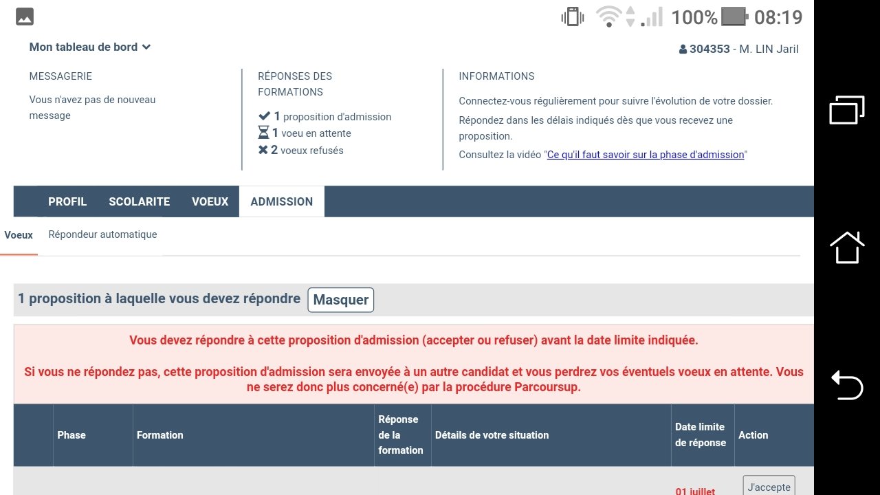 Tu dois répondre à la proposition d'admission (accepter définitivement, accepter mais garder des vœux en attentes ou refuser)