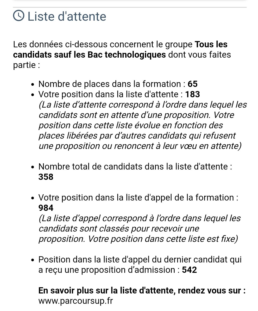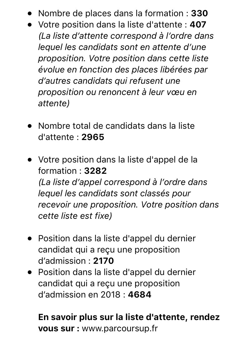 Nombre total de candidats dans la liste d'attente : 166Votre position dans la liste d'appel de la formation : 987