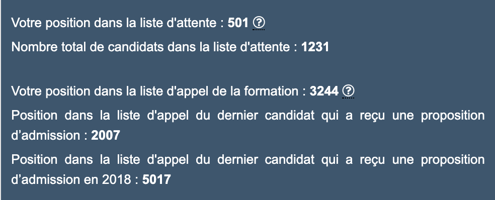 Je suis 300e en fac à Paris (ce que je veux dire par là c’est que ça avance) et ma position dans la liste à la base est beaucoup mieux que celle du dernier candidat à avoir eu une proposition l’année dernière.