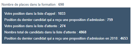 Position du dernier candidat qui a reçu une proposition d’admission en 2018 : 1389Putain qu'est-ce que jvais faire de ma vie bordel