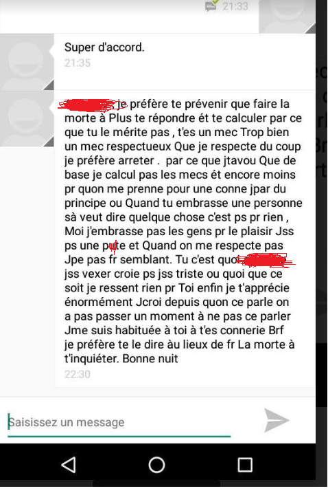 elle arrivé et il y'avais son train qui arrivé, elle a pris son train et la je l'ai ghost et elle ma ecris un pavé comme quoi elle avait kiffé la journée j'ai pas osé lui dire que toute la journée elle ma donné des nausées elle avait même éssayé de m'appeler la semaine d'après