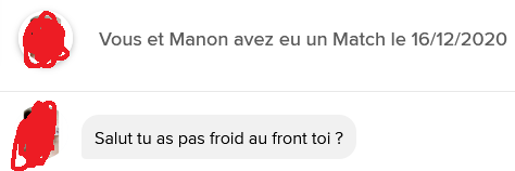 Vous m'avez bien fait rire les kheys, alors j'up ce topic avec une anecdote récente.Ca se passe avec un mec de Tinder avec lequel je discutais très régulièrement depuis deux mois (de l'ordre de plusieurs messages par jour, il m'envoie des photos de lui dont certaines très explicites, bref) et que j'avais déjà rencontré il y a quelques semaines.