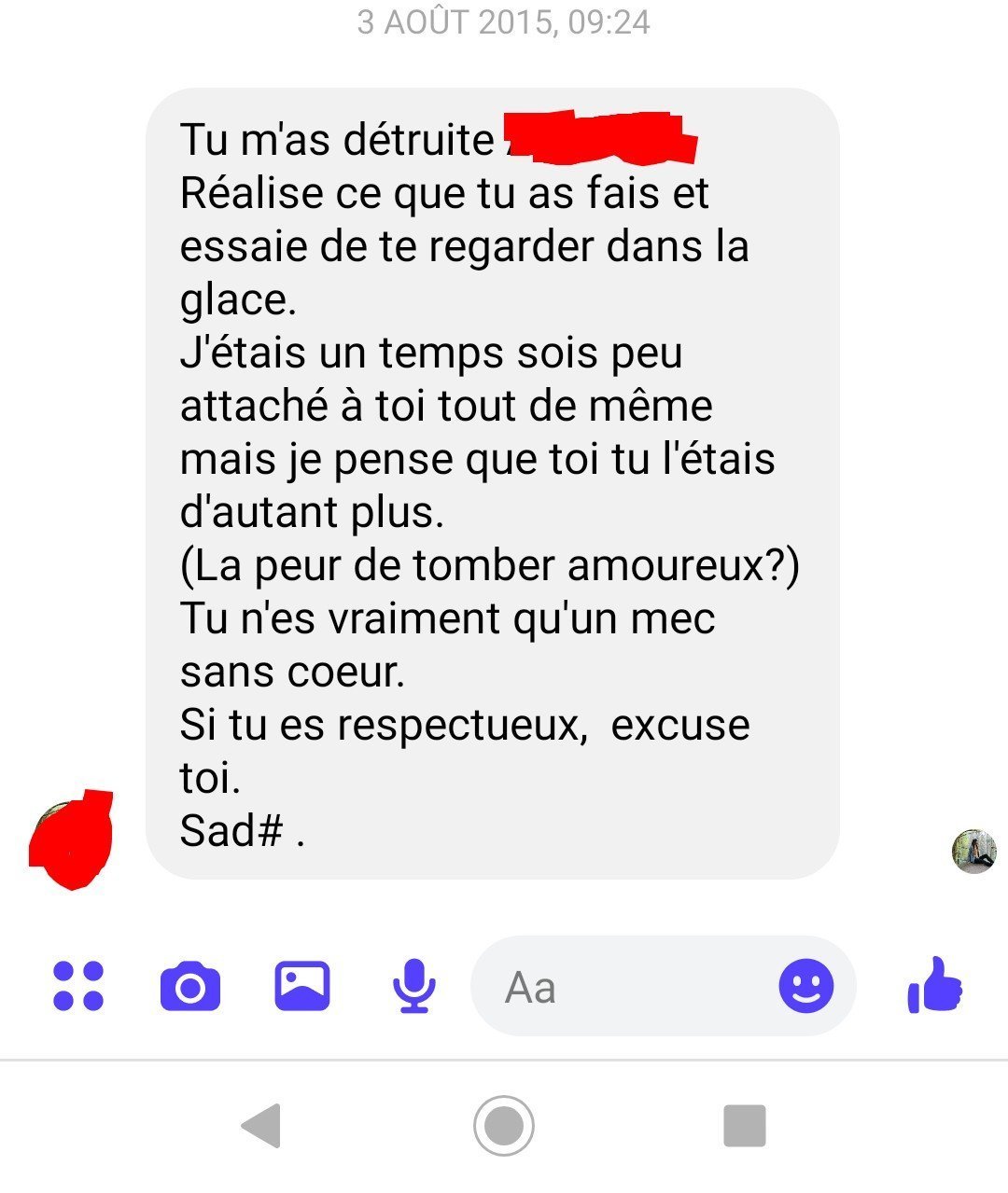 Mais sinon ça me conforte dans l'idée que j'ai raison d'éviter littéralement tous les mecs qui sortent d'un ruptureouais c'est pas un bon bail. J'étais un peu perdu et je savais pas quoi faire, je regrette un peu même