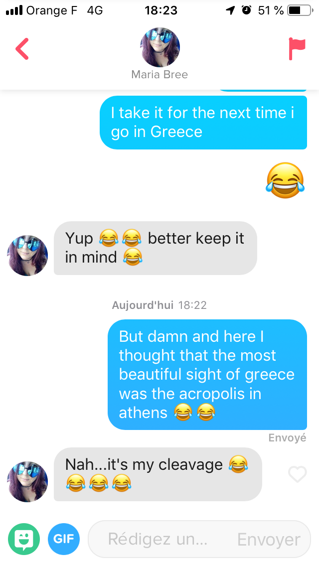 Bon aidez moi sur le game tinderElle est grecque du coup? Si oui dit un truc genre "But damn and here I thought that the most beautiful sight of greece was the acropolis in athens"