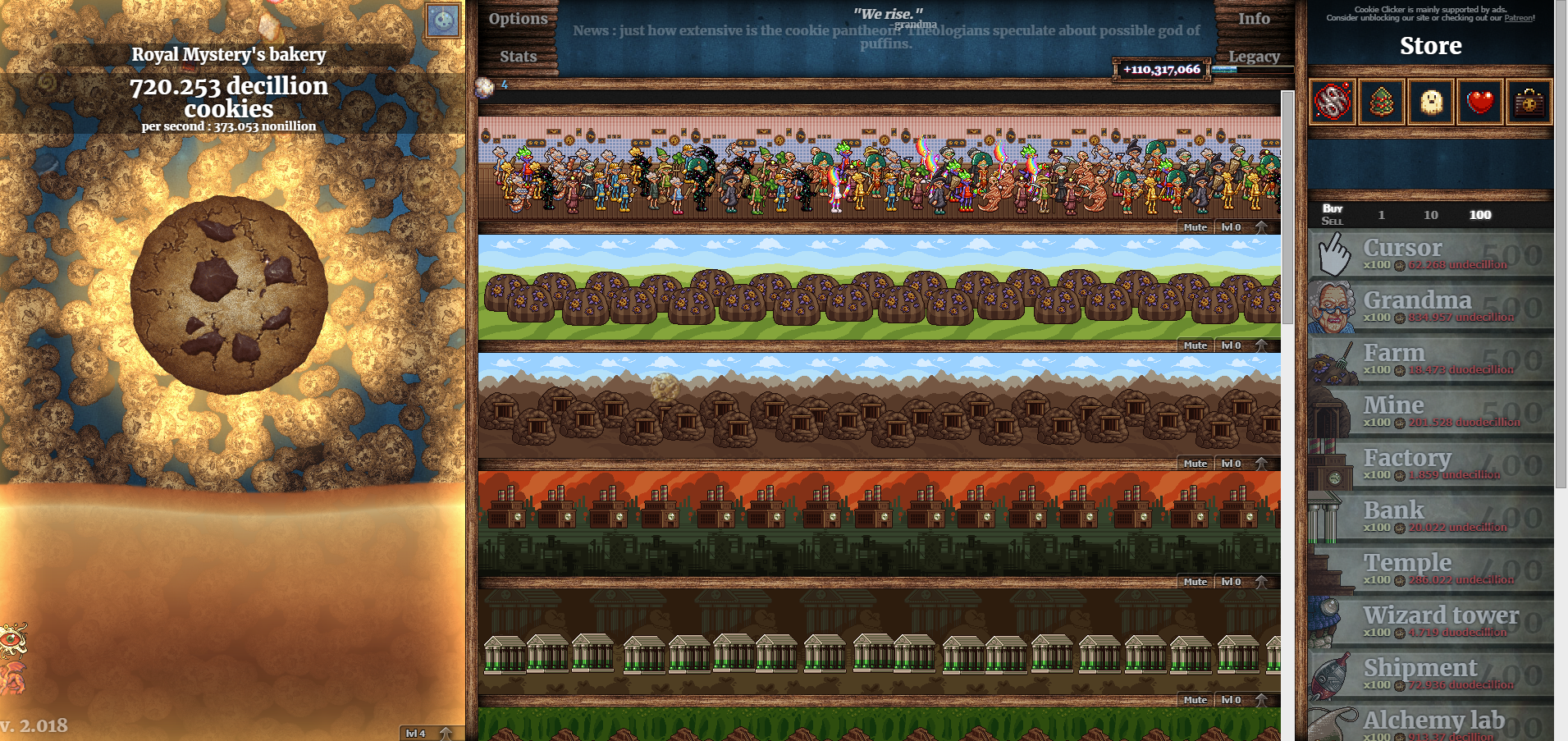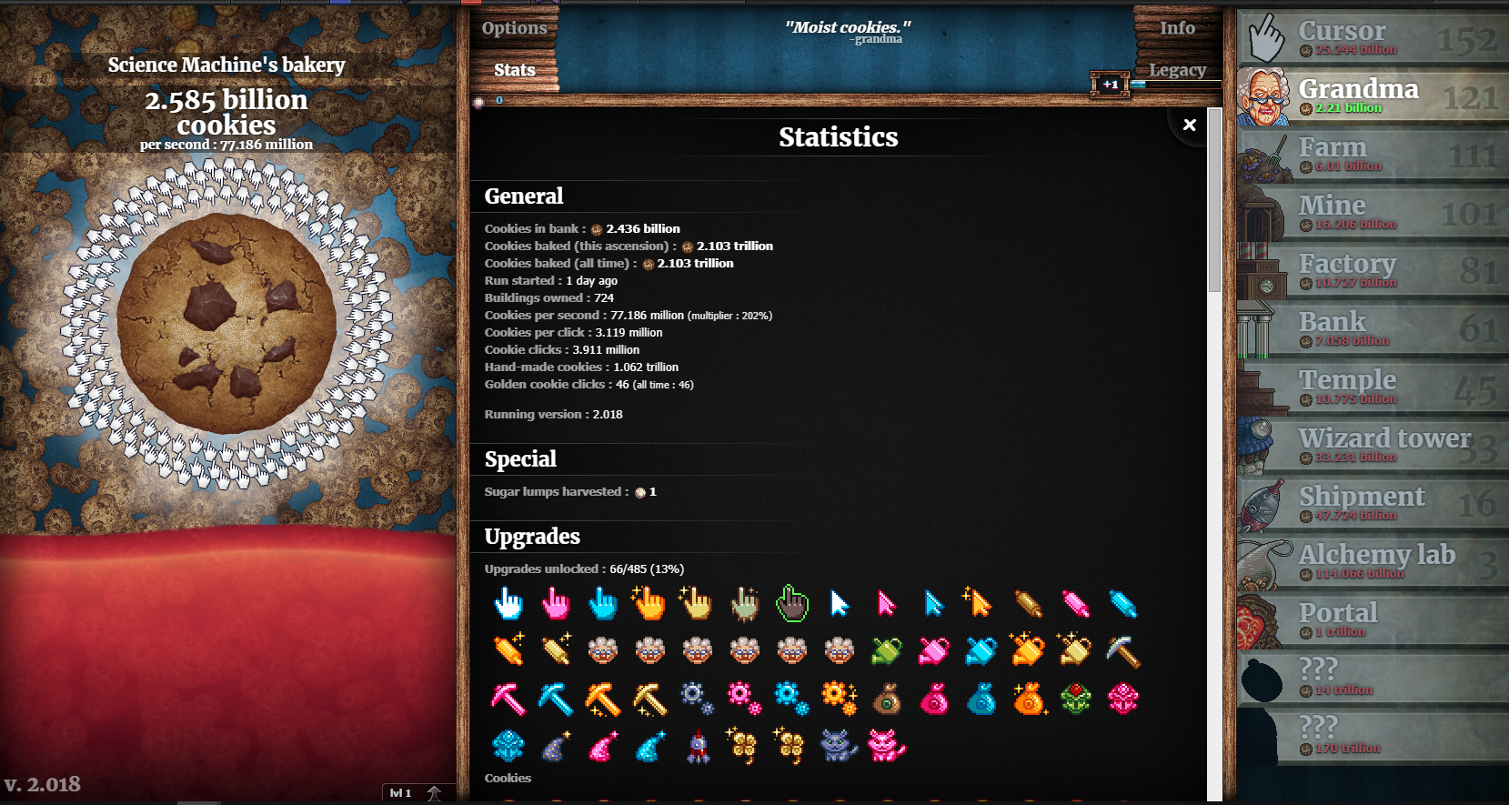 Tu peux up tes différents élements (grand mère, ferme, mine etc...) ta un lvl 0 en bas à droite de leur tableau et si tu clique dessus tu peux dépenser un sugar lump pour les améliorer