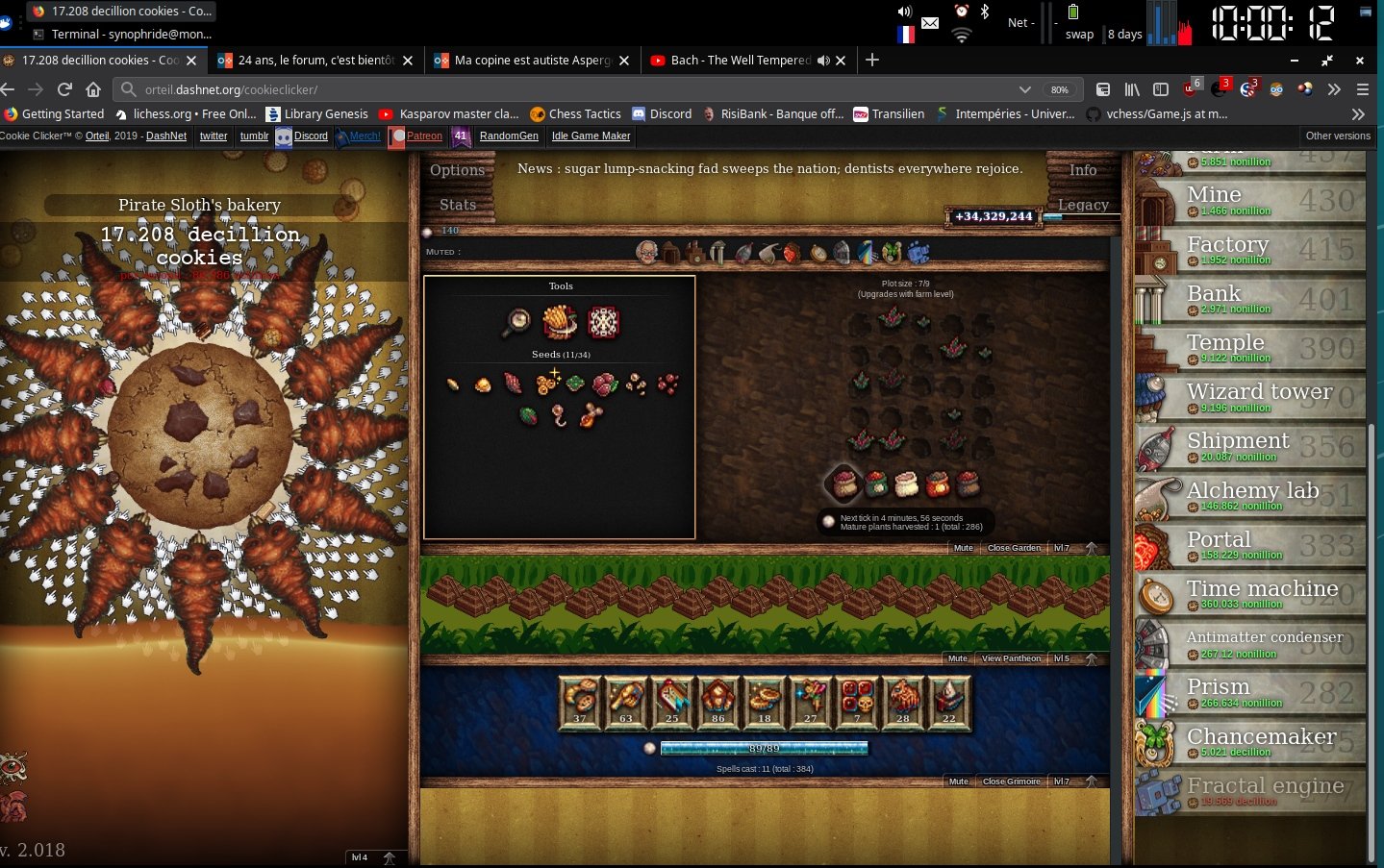 Je m'y suis remis car je suis passé voir ma mère, et j'ai vu sur l'ordinateur Cookie Clicker. Ca fait 5 ans qu'elle joue à ça, elle s'est jamais arrêtée, le jeu tourne toujours en fond. J'ai halluciné, et un peu regretté de lui avoir montré le jeu il y a tant d'années alors que je vivais encore là-bas