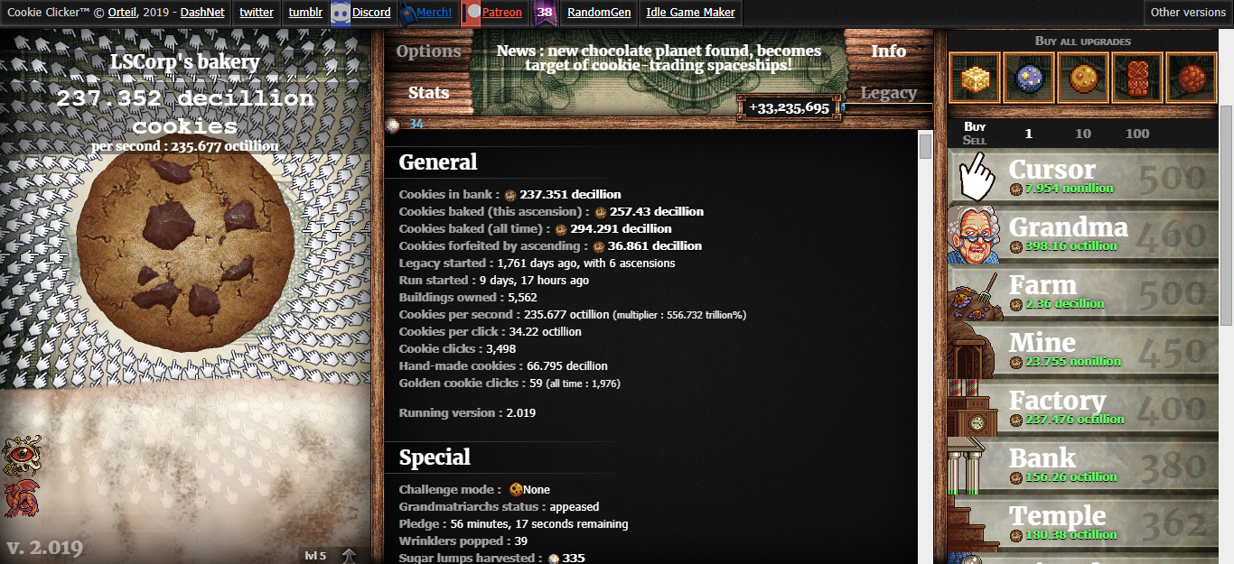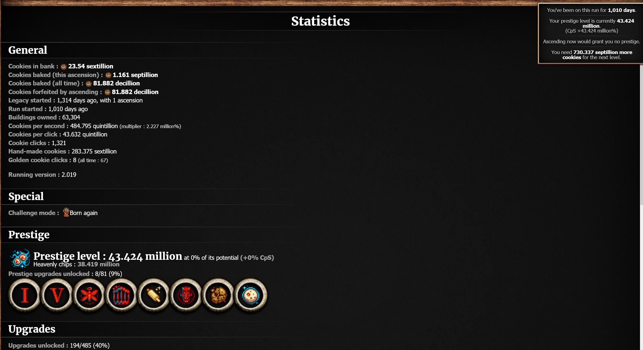 Là par exemple je viens de le faire pour la troisième fois il y a une heure. Je suis reparti de zéro mais une minute plus tard je faisais déjà plusieurs quadrillions par seconde.2,122 sextillions par seconde alors qu'il y a deux heures je faisais 146 quintillions par seconde.