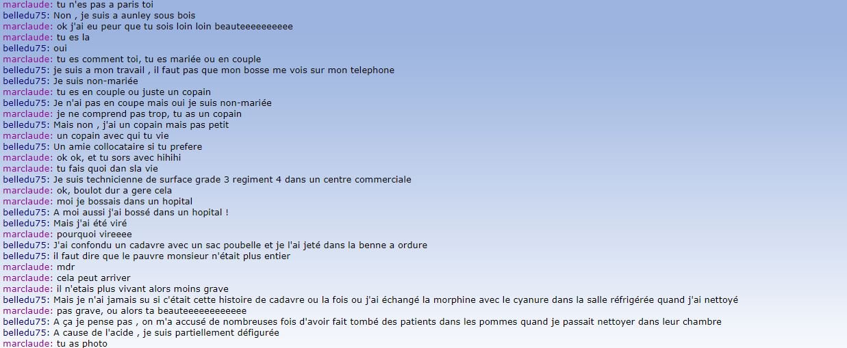La plaisanterie a assez duré, je quitte ce tchat de dégénérés, tout en me demandant vraiment ce que foutent les flics.
