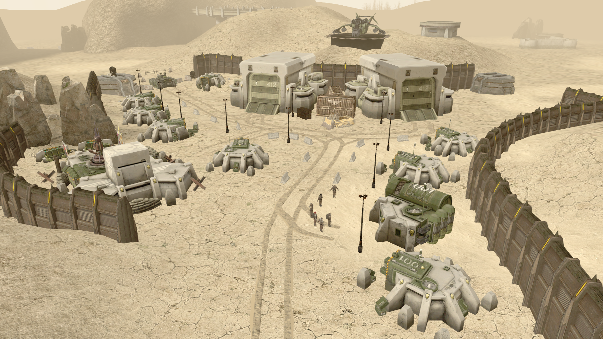 C'est sympa kheyou ! Après c'est un peu étrange que la base soit dans un trou avec des collines autour. Les ennemis peuvent sans problème tirer au dessus des murs depuis le haut des collines. Si tu trouves un modèle de terrain avec une grande colline au sommet aplati tu pourras y mettre la base.