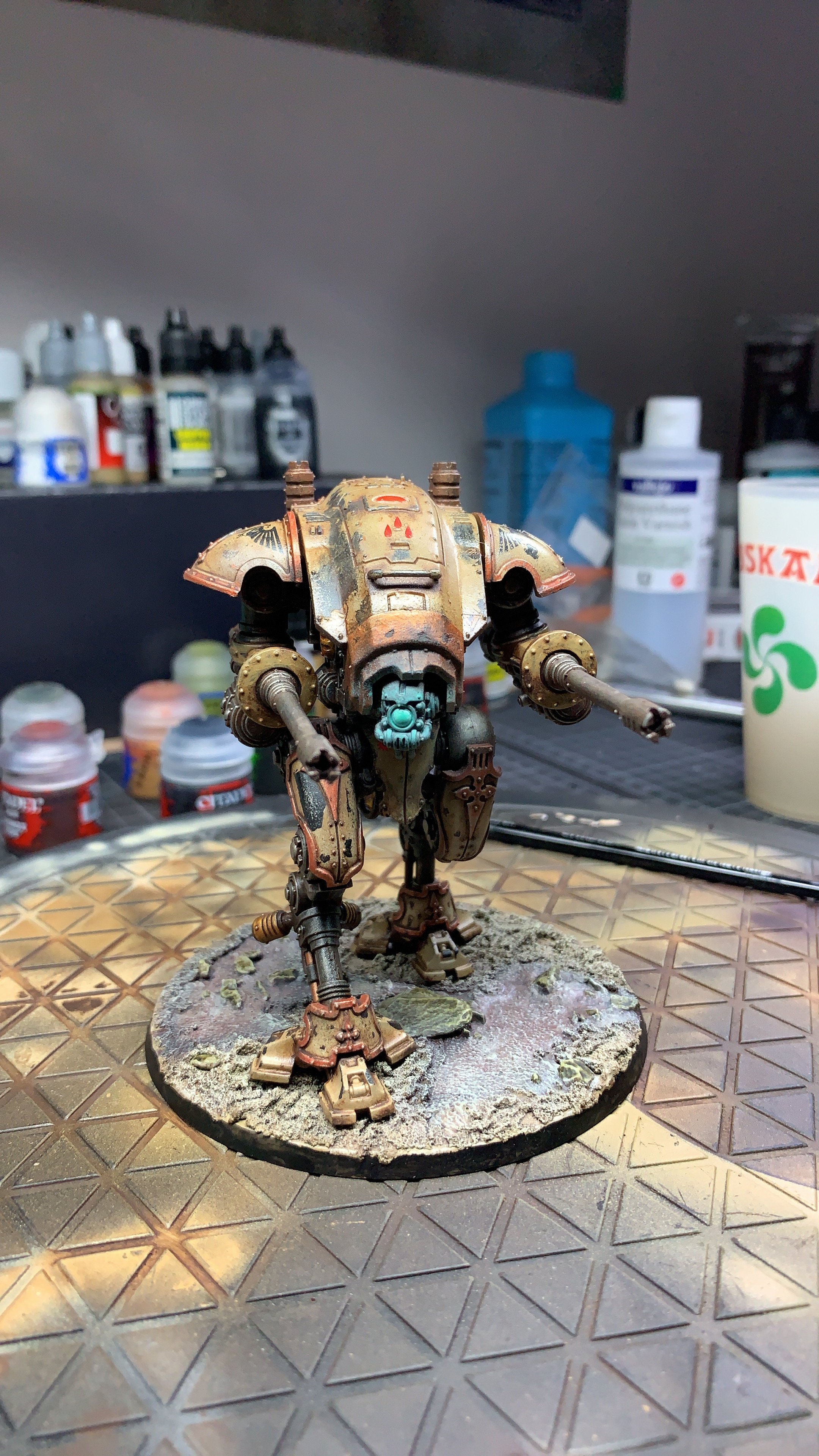 Salut les khey voilà mon premier armiger , c’est la première fois que je peins depuis que j’ai stop le jeux en V5 et première fois que je touche un aéroJe pars sur une armée de death korp + imperial knight .Pour l’instant j’ai 2 baneblade et 3 sentinel en attente de peintures .